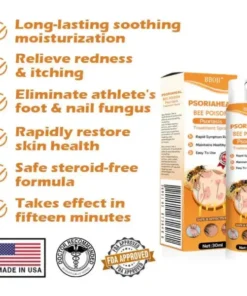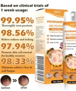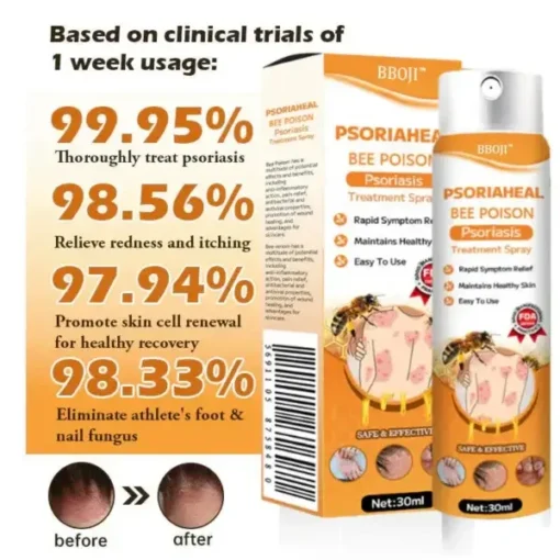 BBOJI™ PsoriaHeal Bee Poison Psoriasis Treatment Spray cleanses the skin from the inside out, alleviating itching and inflammation. It is free from irritating chemicals and does not exacerbate already damaged skin. BBOJI™ helps minimize the growth of skin cells triggered by psoriasis, providing relief from inflammation, itching, and scaling associated with this condition.