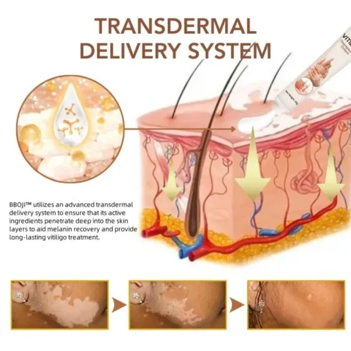 Transdermal Delivery System: Utilizing a sophisticated transdermal delivery system, BBOJI™ ensures its active ingredients penetrate deeply into the skin layers, facilitating melanin recovery and promoting enduring management of vitiligo.