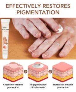 BBOJI™ Vitiligo Therapeutic Cream utilizes a targeted transdermal absorption mechanism to penetrate deep into the skin layers where melanin production occurs. Its blend of natural ingredients, including antioxidants, stimulates melanocytes, promoting pigment synthesis and distribution to the affected areas. By enhancing blood circulation, suppressing tyrosinase activity, and providing moisturizing benefits, the cream supports melanin recovery, ultimately leading to improved pigmentation and a more uniform skin tone over time.