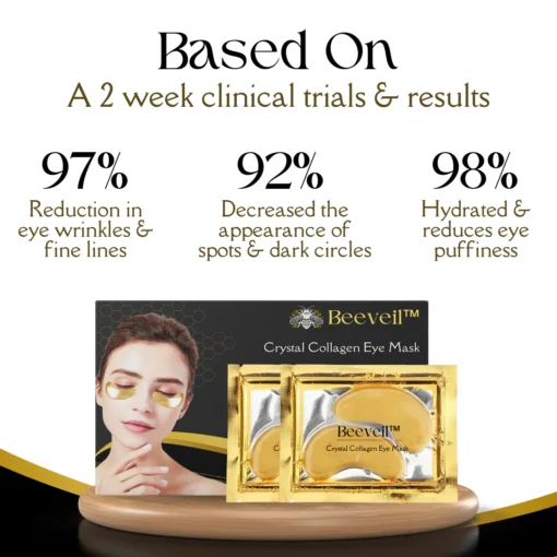 “As a dermatologist with years of experience and extensive research, I highly recommend the Beeveil™ Crystal Collagen Eye Mask to my patients seeking effective and scientifically backed eye skincare. Clinical trials have shown impressive results, with significant improvements in hydration, reduction of fine lines and wrinkles, and overall skin rejuvenation. The potent bee venom, along with key ingredients like glycerin, carob extract, hyaluronic acid, and gold extracts, has been proven through rigorous scientific studies to deliver exceptional benefits, including deep hydration, antioxidant protection, and enhanced skin elasticity. This advanced formula, supported by clinical evidence, provides a luxurious and effective solution for revitalizing the delicate skin around the eyes. Trust Beeveil™ as a dermatologist-approved solution that combines the power of science and nature to help you achieve a youthful and radiant eye area.” – Dr. Ashley C. McDonald, Dermatologist, MD