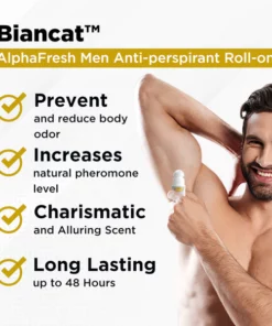 Biancat™ AlphaFresh Men Anti-perspirant Roll-on embodies masculine power, sophistication, and invigorating freshness. You can effectively control body odor while still allowing your natural pheromones to work their magic. Our expertly crafted formula and revolutionary Motion Sense technology deliver bursts of freshness with every movement, ensuring you stay clean and confident all day. Experience up to 48 hours of powerful protection from sweat and body odor while boosting your natural pheromones for added allure, empowering you to conquer challenges with unwavering confidence.