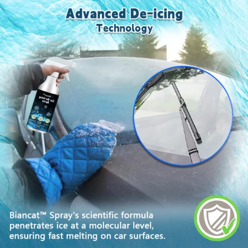 The Biancat™ Auto-Deicing Spray was developed with a state-of-the-art formula that effortlessly melts ice and frost from your car’s windows, mirrors, and locks in seconds. Our specially formulated blend of de-icing agents is designed to combat ice buildup and deliver quick and efficient results without damaging the surfaces of your vehicle.