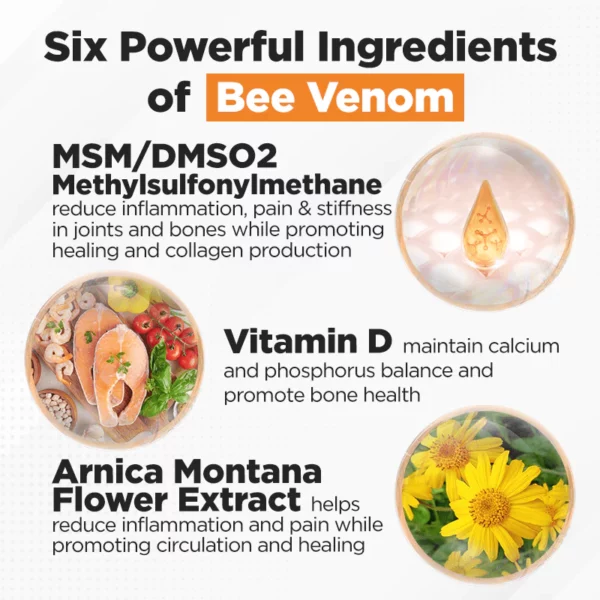 - Ingredients: Bee Venom, Glucosamine, Chondroitin, MSM/DMSO2, Vitamin D, Arnica Montana Flower Extract