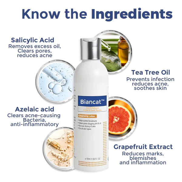 Discover the Secret to Clear, Blemish-Free Skin: Biancat™ DermReborn Acne & Dark Spots Cleansing Lotion. Our advanced formula targets acne, spots, and Acanthosis Nigricans, delivering effective results for a more radiant complexion. With powerful ingredients like Salicylic acid, Azelaic acid, Tea tree oil, and Grapefruit extract, this soap-free cleansing lotion controls breakouts without drying or irritating the skin.