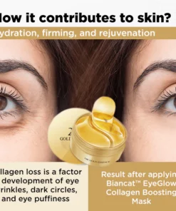 Biancat™ EyeGlow Collagen Boosting Mask is a breakthrough in eye care. The mask is meticulously crafted to address the specific needs of the eye area, providing intensive hydration, firming, and rejuvenation. Our advanced formula combines the potency of collagen and Hyaluronic acid to deliver exceptional results. The hyaluronic acid replenishes moisture and promotes a plumped and revitalized look, while collagen replenishes the skin’s natural moisture barrier, reducing the appearance of fine lines and wrinkles. Experience the ultimate luxury and effectiveness with Biancat™ EyeGlow Mask.