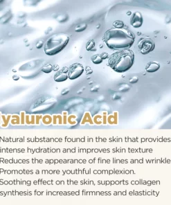 Hyaluronic acid is a natural substance found in the skin that provides intense hydration, improves skin texture, reduces the appearance of fine lines and wrinkles, and promotes a more youthful complexion. It has a soothing effect on the skin, supports collagen synthesis for increased firmness and elasticity, and acts as a protective barrier against environmental damage.