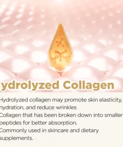 Hydrolyzed collagen, also known as collagen peptides, is collagen that has been broken down into smaller peptides for better absorption. It is commonly used in skincare and dietary supplements. Hydrolyzed collagen may promote skin elasticity, hydration, and reduce wrinkles. It can also support joint health, strengthen hair and nails, and potentially benefit gut health.