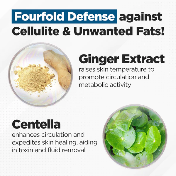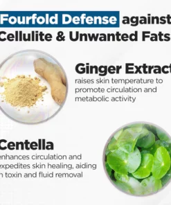 Ginger Extract: Known for its thermogenic properties, ginger extract raises skin temperature to promote circulation and metabolic activity. This helps burn fat cells and reduce cellulite. It also contains antioxidants and anti-inflammatory properties, contributing to smoother skin.