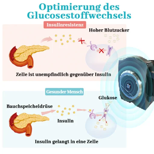 Muskeln spielen eine grundlegende Rolle im Glukosestoffwechsel, indem sie Glukose durch komplexe biochemische Reaktionen in Energie umwandeln. Das Biancat™ GylcoNova Elektrische Pulsgerät verwendet die EMS-Technologie, um potenziell die Stoffwechselraten durch induzierte Muskelkontraktionen zu erhöhen. Diese Steigerung der Stoffwechselaktivität könnte zu einer effizienteren Glukoseaufnahme durch die Zellen führen, was zu einem reduzierten Glukosespiegel im Blutkreislauf führt. Ein solcher Prozess bietet das Potenzial für eine verbesserte Blutzuckerregulierung und stellt einen bedeutenden Fortschritt im Management von Diabetes dar.