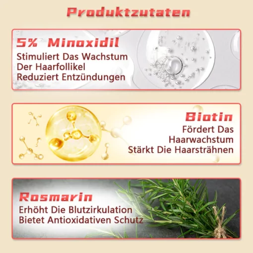 Mit einer synergetischen Mischung aus 5 % Minoxidil, Biotin und Rosmarin werden mehrere Aspekte von Haarausfall und Haarverdünnung effektiv behandelt. Diese Kombination fördert die Durchblutung der Haarfollikel, blockiert DHT-Effekte und versorgt die Haare mit essenziellen Nährstoffen.