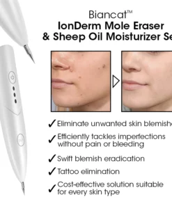 The Biancat™ IonDerm Mole Eraser & Sheep Oil Moisturizer Set is more than just a tool—it’s a commitment to excellence. Expertly crafted to effectively erase skin spots like moles, skin tags, and warts, this device promises to deliver smoother, clearer, and rejuvenated skin. With its ergonomic design ensuring a steady grip, its precision tip zeroes in on blemishes, granting you the gift of radiant, flawless skin.