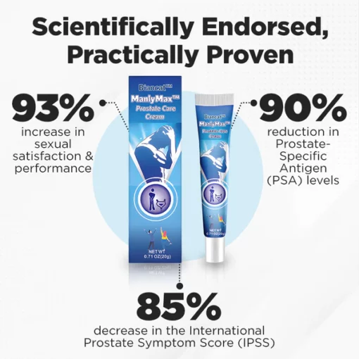 A clinical trial with eighty male participants attested to the effectiveness of Biancat™ ManlyMax Prostate Care Cream. The immediate and long-term benefits were evidenced by the following statistics: a 90% reduction in Prostate-Specific Antigen (PSA) levels, signaling improved prostate health; an 85% decrease in the International Prostate Symptom Score (IPSS), reflecting reduced urinary symptoms; and a 93% increase in sexual satisfaction and performance. These percentages highlight the multifaceted success of the cream in supporting prostate well-being and boosting intimate encounters.
