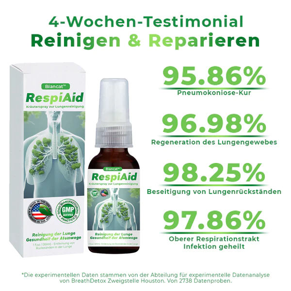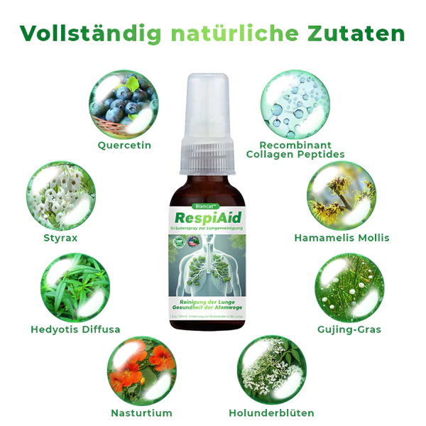 Entdecken Sie die Kraft der Natur mit Biancat™ RespiAid, Ihrem natürlichen Verbündeten für optimale Lungen- und Atemwegsgesundheit. Unser fachmännisch entwickeltes Kräuterspray bietet eine bahnbrechende Lösung für die respiratorischen Herausforderungen, die durch Allergien, Asthma, Rauchen, COPD, Lungenentzündung, Bronchitis und geschwächte Atemwege entstehen. Erleben Sie innerhalb von nur 8 Wochen eine Transformation Ihrer Atmung, mit unserer Formel, die darauf ausgelegt ist, die Lungen zu reinigen, Schleim zu eliminieren und Ihr Atmungssystem zu stärken.