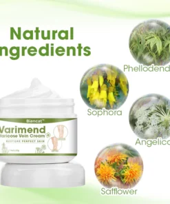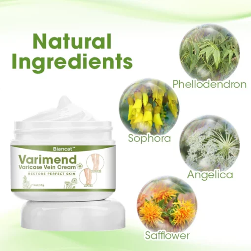 Biancat™ VariMend Varicose Vein Cream combines potent active natural ingredients with a comprehensive strategy to target varicose veins and promote healthier skin. The cream’s venotonic components work to fortify vein walls, boost circulation, and mitigate the blood pooling those results in varicose veins. Alongside this, skin-enriching elements enhance tone and hydration, fostering a healthier and more even skin texture and tone around the affected area. The cream also integrates natural anti-inflammatory agents to help ease the discomfort and swelling linked with varicose veins. Regular use, as advised, can visibly improve both the varicose veins and the overall skin appearance.