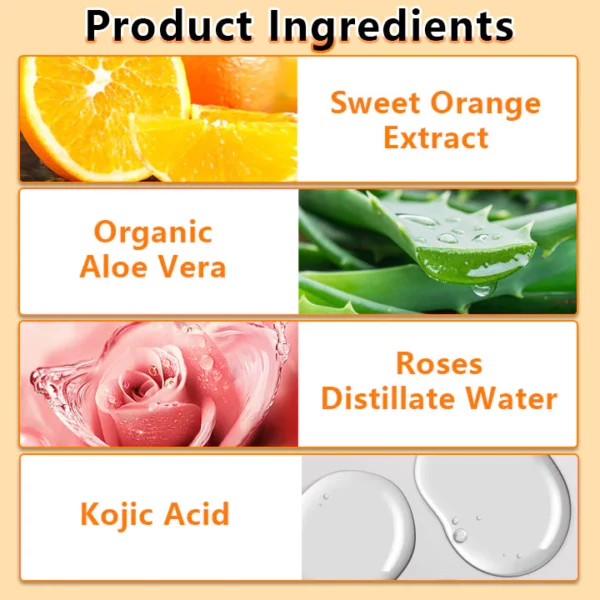 - Ingredients: Sweet Orange Extract, Rose Distillate Water, Organic Aloe Vera, and Kojic Acid.