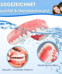Vertrauenswürdige Qualität und Sicherheit: Mit [Produktname] können Sie auf unser Engagement für sowohl Qualität als auch Sicherheit vertrauen. Das Zahnersatz-Set besteht aus hochwertigem, ungiftigem Silikon, das sorgfältig getestet wurde, um sicherzustellen, dass es genauso sanft zu Ihrem Zahnfleisch wie auch langlebig ist. Dieses sichere Material bietet eine lang anhaltende, bequeme Passform, sodass Sie die Vorteile Ihres Zahnersatzes sorgenfrei genießen können. Unser Silikon ist darauf ausgelegt, dem täglichen Gebrauch standzuhalten, während es seinen Komfort und seine Integrität bewahrt, was Ihnen bei jedem Lächeln ein gutes Gefühl gibt. Seien Sie sicher, dass Sie mit unserem Set in ein Produkt investieren, das Ihre Gesundheit und Ihr Wohlbefinden in den Mittelpunkt stellt.