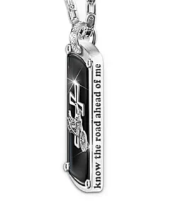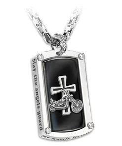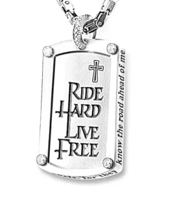 Superbly handcrafted in tough-as-a-biker stainless steel, this striking bikers necklace features a sculpted custom bike and cross icon against a jet black ion-plated background. Adding to its special meaning, this keepsake is engraved on the back with a cross and biker’s motto “RIDE HARD LIVE FREE,” while etched on the sides are words from the powerful “Biker’s Blessing” poem. Strong demand is expected, so don’t wait. Order now!