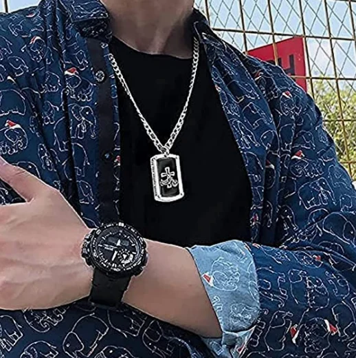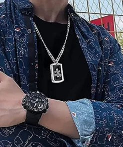 This bikers dog tag necklace includes raised corner rivets on the front and back and a unique bail in the shape of a motorcycle tire, which holds a 24-inch stainless steel custom “bike chain”.