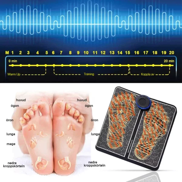 - Bättre blodcirkulation – Små pulser skickas genom fötterna och underbenen för att stimulera musklerna och förbättra blodcirkulationen så att svullna ben och fötter försvinner.