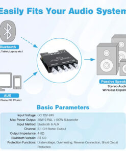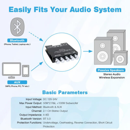 Upgrade your sound system with the Bluetooth 5.0 Subwoofer Amplifier Board, a high-efficiency 2.1 channel amp powered by the reliable TPA3116D2 HiFi chipset. Delivering a total output of 150W (50W + 50W stereo + 100W subwoofer), this board is built for crystal-clear, distortion-free sound—perfect for DIY speaker setups, home theaters, and portable audio rigs.