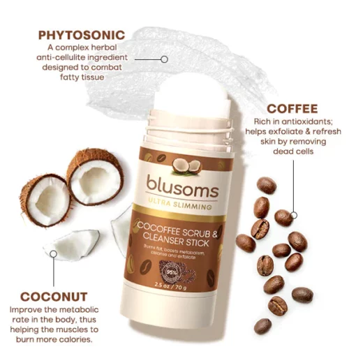 Blusoms™ CoCoffee Scrub & Cleanser stick is a cutting-edge product that utilizes the powerful properties of coconut, coffee, and phytosonic to promote weight loss and reduce cellulite. The synergistic effects of these ingredients work to enhance skin elasticity, firmness, and hydration, while simultaneously reducing the appearance of cellulite. With regular use, individuals can expect to see remarkable improvements in the overall health and appearance of their skin, accompanied by a reduction in cellulite and weight loss. The powerful combination of ingredients in this product has been shown to effectively combat the effects of aging, while promoting skin health and vitality.