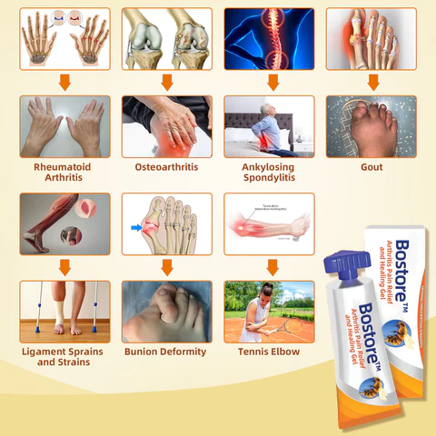 Bostore™ Gel effectively treats a wide range of joint problems, including osteoarthritis, rheumatoid arthritis, bursitis, tendonitis, osteoporosis, gout, carpal tunnel syndrome, ligament strains and sprains, thumb deformities, and tennis elbow, among other.
