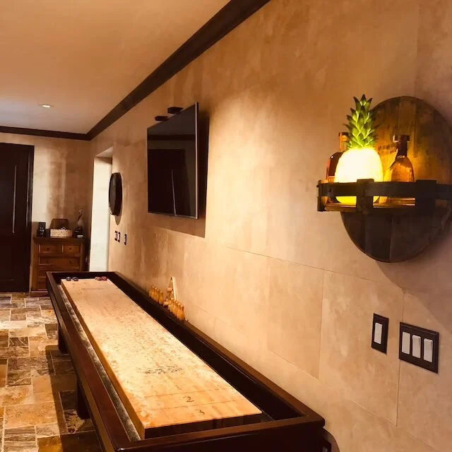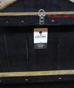 The shelf is finished in polyurethane to accent the beauty of the barrel oak. The back of the shelf is crafted to the same detail as the front and comes with a D-ring hanger mounted on the back that is rated at 75 pounds. The shelf will hold approximately 7 bottles depending on how they’re placed.