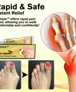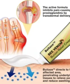 Introducing Buitaze™ Bee Venom Bunion Relief Cream, a revolutionary breakthrough in foot care. Developed meticulously to target the pain and discomfort associated with bunions, our innovative formula stands as a beacon of relief for those suffering from this common ailment. What sets Buitaze™ apart is its exceptional blend, crafted to harness the potent healing properties of bee venom. This natural ingredient doesn’t just offer instant relief; it actively works to diminish inflammation and gradually reduce the size and severity of bunions with consistent use. Buitaze™ isn’t just a cream; it’s a comprehensive solution designed to transform your foot health and restore comfort to your every step.