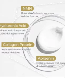 - Core ingredients: Pure NMN (nicotinamide mononucleotide), Collagen, Hyaluronic Acid