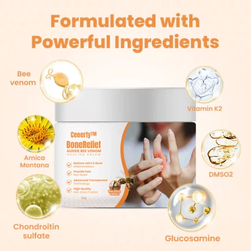 Ceoerty™ BoneRelief Aussie Bee Venom Healing Cream is specifically designed to penetrate the skin and reach the joint and bone area to provide relief and aid in the recovery of injuries. The cream utilizes advanced transdermal technology, which allows its active ingredients to effectively permeate the skin barrier and target the underlying tissues. Bee sting venom, known for its anti-inflammatory and analgesic properties, reduces inflammation and pain associated with joint and bone injuries. It also stimulates the regeneration of damaged cells and tissues, aiding in the recovery process.