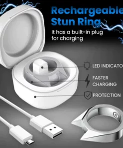 Rechargeable Stun Ring – It has a built-in plug for charging and a charging dock equipped with a high-quality internal battery that is fully rechargeable. The battery can remain charged for 30-45 days unless you use it. Cables are provided in standard outlets which allows hassle free charging, so you don’t need to purchase any expensive batteries all the time.