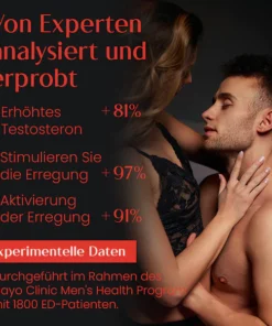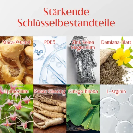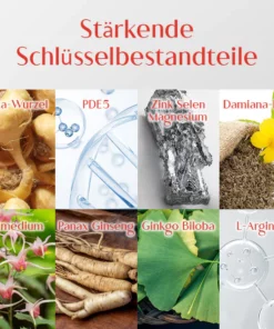 Inhaltsstoffe: Maca-Wurzel, PDE5, Zink, Selen, Magnesium, Damiana-Blatt, Geiles Ziegenkraut (Epimedium), Panax Ginseng, Ginkgo Biloba & L-Arginin