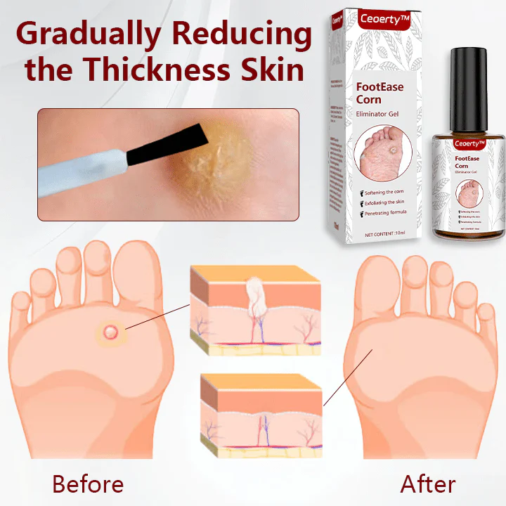 Regular use of the Ceoerty™ FootEase Corn Eliminator Gel over time can assist in accelerating the natural exfoliation process, progressively lessening the thickness and size of the corns on the feet. Smoother and healthier skin is shown when the dead skin cells are removed.