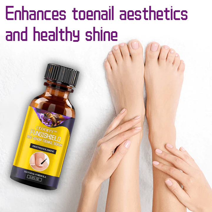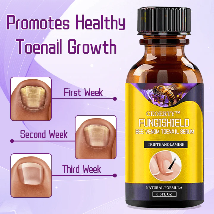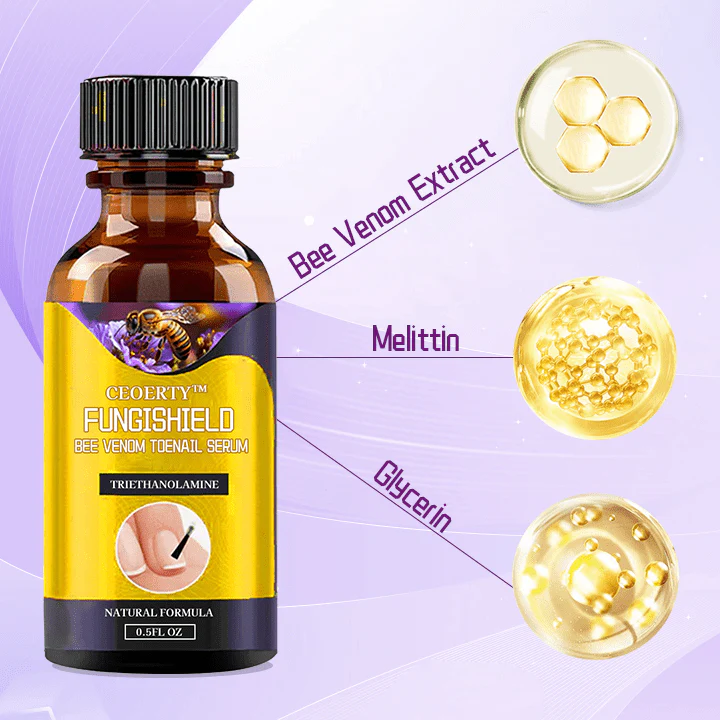 Promotes Healthy Toenail Growth. Ceoerty™ FungiShield contains specific enzymes from bee venom that activate cell proliferation and metabolism in the nail matrix, accelerating the repair of damaged nails and the growth of new ones. These active enzymes also promote collagen synthesis, enhancing the natural strength and speed of nail growth, making them healthier and more resilient. 🌿📈