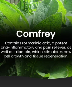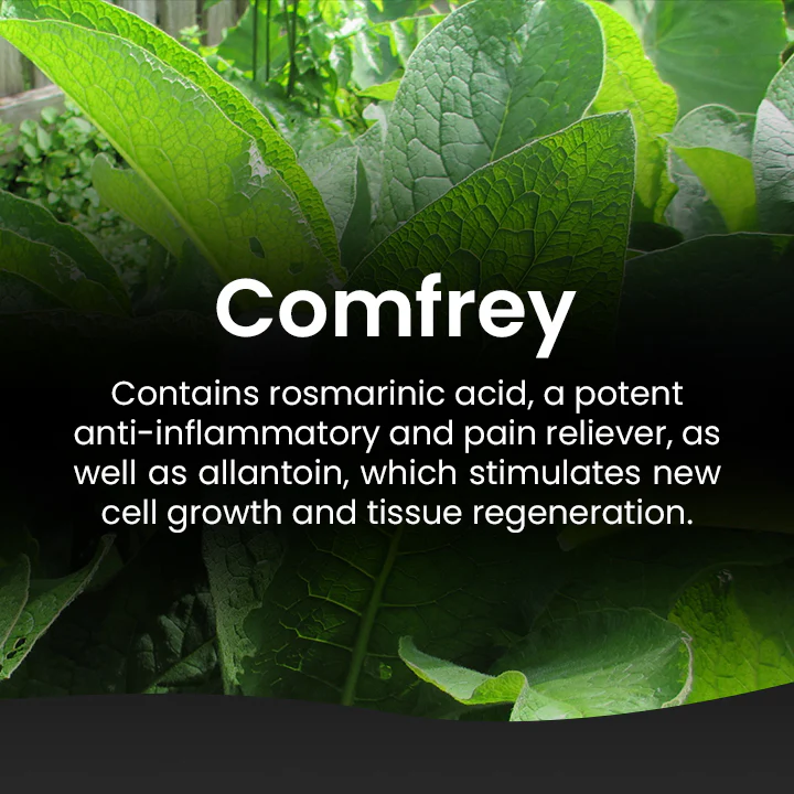 Comfrey, which contains rosmarinic acid, a potent anti-inflammatory and pain reliever, as well as allantoin, which stimulates new cell growth and tissue regeneration. Traditionally used for fractures, bruises, sprains, and inflammation.