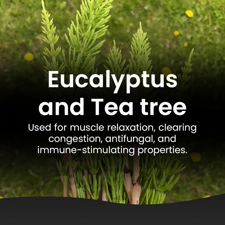 Added essential oils of Eucalyptus and Tea tree are used for muscle relaxation, clearing congestion, antifungal, and immune-stimulating properties.