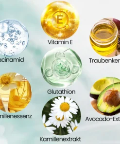 Inhaltsstoffe: Niacinamid, Vitamin E, Sonnenblumenextrakt (Sonnenblumenkernöl), Avocado, Glutathion, Rosenextrakt, Kamille.