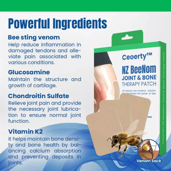 Ceoerty™ NZ BeeNom Joint & Bone Therapy Patch is an all-natural, non-invasive solution that harnesses the power of bee venom. Specifically designed to penetrate the skin and reach the joint and bone area to provide relief and aid in the recovery of injuries. The patch utilizes advanced transdermal technology, which allows its active ingredients to effectively permeate the skin barrier and target the underlying tissues. Bee venom, known for its anti-inflammatory and analgesic properties, reduces inflammation and pain associated with joint and bone injuries. It also stimulates the regeneration of damaged cells and tissues, aiding in the recovery process.