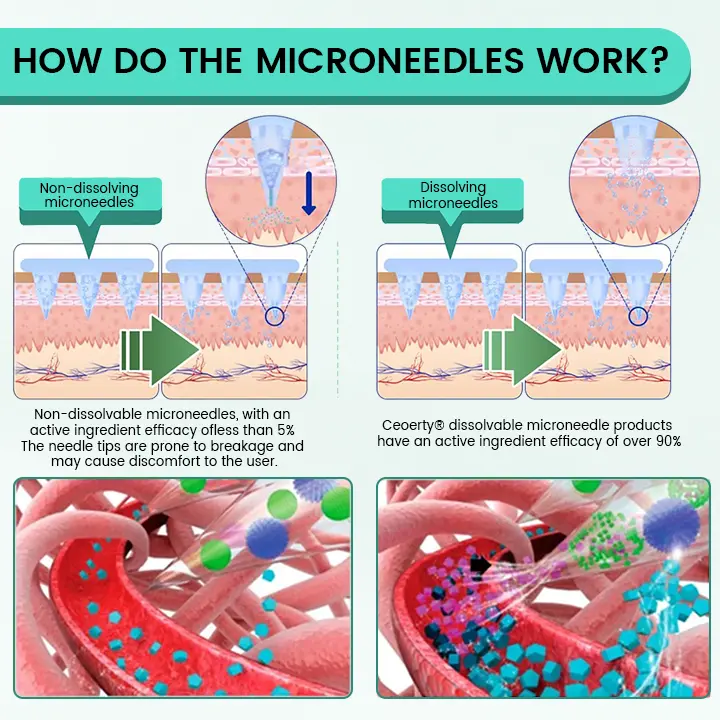 Apply the microneedle patch to areas with good blood circulation, such as the upper arm or abdomen. Avoid applying it to joints or areas with frequent movement to prevent patch detachment or microneedle breakage due to friction. - Are there any side effects?