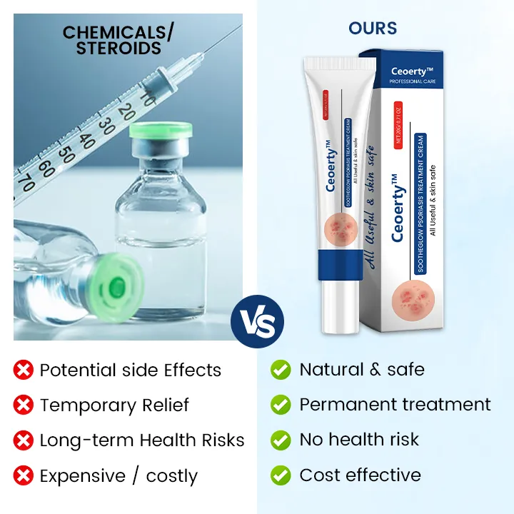 Unlike traditional psoriasis treatments that rely on potent chemicals and steroids—which can thin the skin and cause long-term irritation—Ceoerty™ SootheGlow Psoriasis Treatment Cream uses a gentle, natural formula that delivers effective results without harmful side effects. It not only alleviates immediate symptoms but also promotes long-term skin health, providing a safer and more sustainable solution for managing psoriasis.