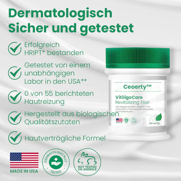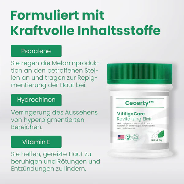 Ceoerty™ VitiligoCare Revitalisierendes Elixier zeichnet sich durch seine besonderen Eigenschaften bei der Reduzierung der Immunreaktion in Vitiligo-Flecken aus. Wenn Sie diese beruhigende Creme auf die betroffene Haut auftragen, können Sie die Depigmentierung stoppen und die Wiederherstellung der geschädigten Keratinozyten und Melanozyten unterstützen. Sie hilft bei der Repigmentierung der von Vitiligo betroffenen Haut.
