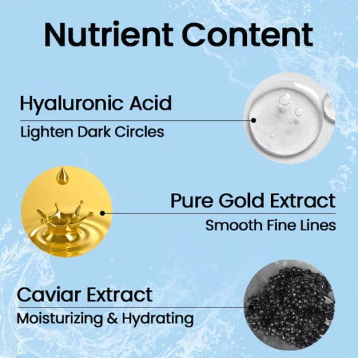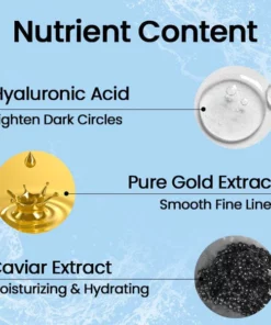 Ingrdient: Hyaluronic Acid, Pure Gold Extract, Caviar Extract, Squalane, Xanthan Gum, Xanthan Gum, Hydroxyethylcellulose,Vitamin E