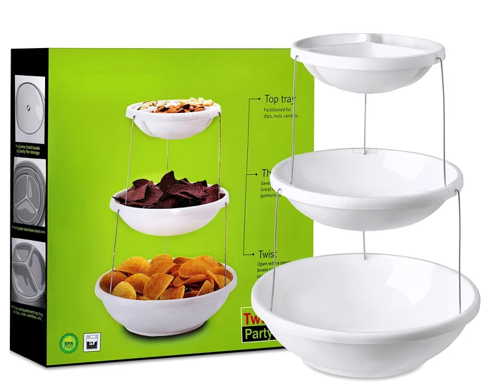 Requires Minimal Storage Space: The patented plastic bowls twist down and nest in one another making it easy to store.