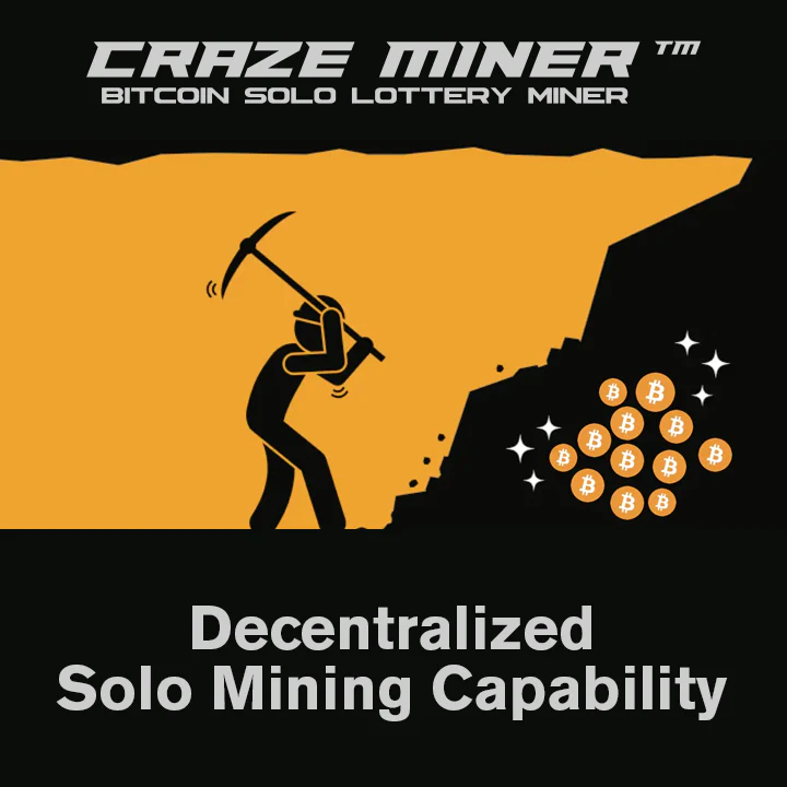 - Enabling users to participate in decentralized solo mining, the Craze Miner™ Bitcoin Solo Lottery Miner eliminates the need for reliance on external mining pools, affording greater autonomy to individual miners in their pursuit of potential block rewards.