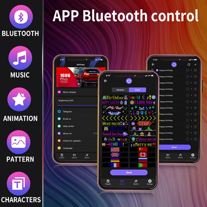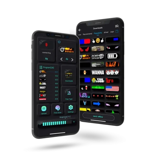 Simply plug the USB into a power source, use the app on your Apple or Android device, connect via Bluetooth, and unlock a world of features. Free-draw, free-text, upload your own images or GIFs, but here’s the kicker: Our App got an online library packed with tons of GIFs. Imagine cruising down the street with the coolest GIFs in the universe – your car’s gonna steal the spotlight like never before!