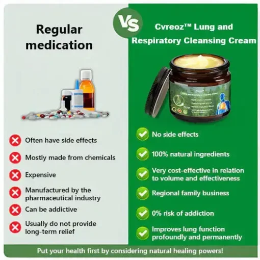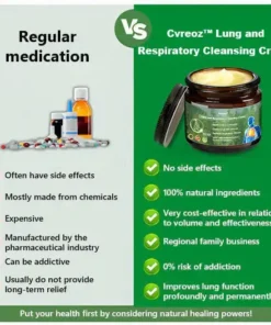We designed it as a ๐น๐๐ป๐ด-๐ฐ๐น๐ฒ๐ฎ๐ฟ๐ถ๐ป๐ด ๐ฐ๐ฟ๐ฒ๐ฎ๐บ for convenience. Compared to drops or capsules, Cvreozโข ๐ ๐๐น๐น๐ฒ๐ถ๐ป ๐๐น๐ฒ๐ฎ๐ฟ ๐๐๐ป๐ด ๐ฅ๐ฒ๐ฝ๐ฎ๐ถ๐ฟ ๐๐ฟ๐ฒ๐ฎ๐บ is portable and ready to use, making it ideal for modern, fast-paced lifestyles. Additionally, application allows the ingredients to be released gradually, providing ongoing benefits rather than absorbing them all at once โ which is especially beneficial for managing chronic respiratory problems. Our product is made with natural herbal ingredients and smells faintly of fresh grass, while also effectively moisturizing the lungs.
