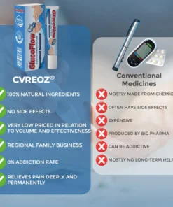 CVREOZ® GlucoFlow Diabetes Treatment Cream offers targeted relief and care for diabetic skin, delivering real healing results where it matters most. Backed by impressive user statistics, 97% of users report a reduction in foot sores and ulcers, 95% experience improved blood circulation, and 93% notice healthier skin overall. Made with 100% natural ingredients and FDA-approved standards, CVREOZ® GlucoFlow Diabetes Treatment Cream provides a safe, gentle solution for sensitive, at-risk skin. Its easy-to-apply formula is designed to soothe, protect, and restore diabetic skin – giving users confidence, comfort, and satisfaction, all with a 100% satisfaction guarantee.