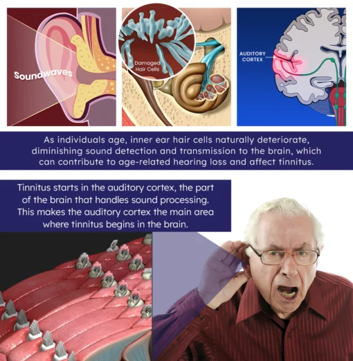 As You Age, the hairs inside your inner ear are easily bent or broken — the damaged cells can “leak” random electrical impulses to your brain, causing tinnitus.