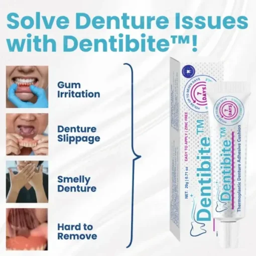 As it cools and sets, Dentibite™ hardens into a durable yet flexible layer, offering a firm grip that lasts for days. This eliminates the need for messy reapplications often required with traditional adhesives. With its no-mess, no-residue formula, removing Dentibite™ is just as easy as applying it—simply soak the dentures in warm water, and the adhesive cushion softens for effortless removal. Designed for both full and partial dentures, Dentibite™ provides a secure, comfortable, and irritation-free experience for denture wearers. Say goodbye to loose dentures and constant adhesive reapplications—Dentibite™ lets you enjoy a confident, worry-free smile with a natural, second-skin feel.