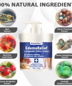 DetoxFlow™ EdemaRelief Lymphatic Detox Cream features Root Extract, a powerful ingredient known for its ability to relieve swelling and discomfort. It promotes improved blood circulation and reduces fluid retention, making it effective in addressing both edema and lymphatic issues.